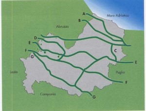 De samnieten, de eerste bewoners, waren een herdersvolk en over de Tratturi trokken zij met hun vee (koeien, schapen en geiten) in de winter naar Puglia en in het voorjaar naar de Apennijnen om het vee te laten grazen. Deze Tratturi, worden ook wel de ‘groene snelwegen’ genoemd, ontstaan door het getrappel van het vee, de zogenaamde schapen tracks. Op de kruispunten en langs deze wegen zijn nog vele oude restanten omdat zich hier ook het dagelijkse leven afspeelde, handel werd gedreven enz.