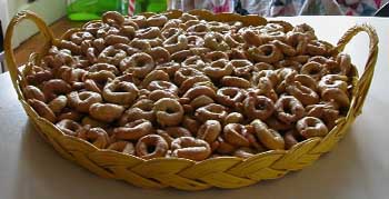 Een goed deeg maken is moeilijk want de olijfolie maakt het deeg erg hard, uren moet je kneden totdat je een mooi deeg hebt. Hier maak je rollen van die je daarna tot een cirkel vouwt. Twintig minuten in de oven en ze kunnen gegeten worden!