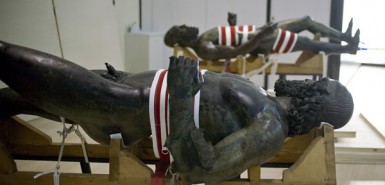 Het is mogelijk om de restauratie van de immense Griekse bronzen beelden van dichtbij en op de voet te volgen, gedurende de komende maanden waarin de werkplaats open is voor publiek.
