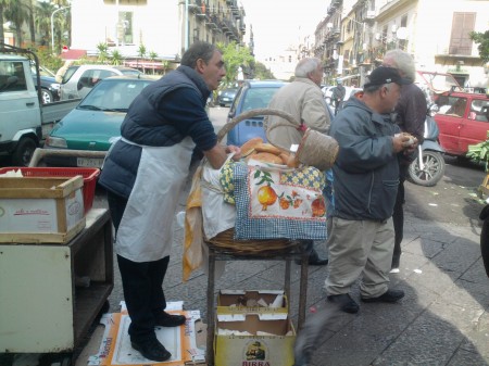 Het contrast kon niet groter, de avond ervoor had ik een galadiner bijgewoond, die vanaf het aperitief tot aan het dessert noemenswaardig was. Al de bekende Siciliaanse produkten en ingrediënten waren erin verwerkt. De volgende morgen stond ik al vroeg op de zondagochtend markt midden in het centrum van Palermo, het was aardig druk. Aan het begin van de markt stond een man die gelijk mijn aandacht trok, dit was de ‘quarumaru’, dit is de verkoper van de ‘quarumi’, ook een noemenswaardig gerecht, die je echter minder gauw krijgt voorgeschoteld, maar toch zeker een typisch Siciliaanse specialiteit is. Waarschijnlijk moet je hiermee zijn opgegroeid om dit gerecht echt te kunnen waarderen. Het bestaat namelijk uit de ingewanden van runderen, deze zijn gekookt met uien, wortelen, selderij en peterselie. Dit wordt warm geserveerd met zout, peper, olijfolie en citroen. Je kunt dit van ’s morgens tot ’s avonds op de markten in Palermo of Catania vinden. Hoe het broodje geserveerd werd met deze ‘quarumi’ maakte op mij nog de meeste indruk, de man stond met zijn mouwen opgestrookt achter de met doeken bedekte mand en stak zijn arm erin om vervolgens met een handvol ingewanden er weer uit te komen om daarmee je broodje te beleggen! De foto’s geven de situatie prachtig weer.