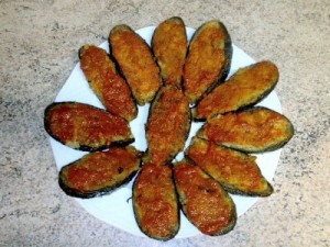 Om te beginnen koop je een aantal aubergines, het liefst niet al te groot. De grootste kans om die te vinden, is op de markt. Deze snijdt je doormidden en voorzichtig zonder de schil kapot te maken, haal je het vruchtvlees eruit, (dit lukt het beste met een grote lepel). De schillen kook je vervolgens even kort, terwijl je het vruchtvlees ongeveer 20 minuten laat koken. De schillen houd je vervolgens apart.